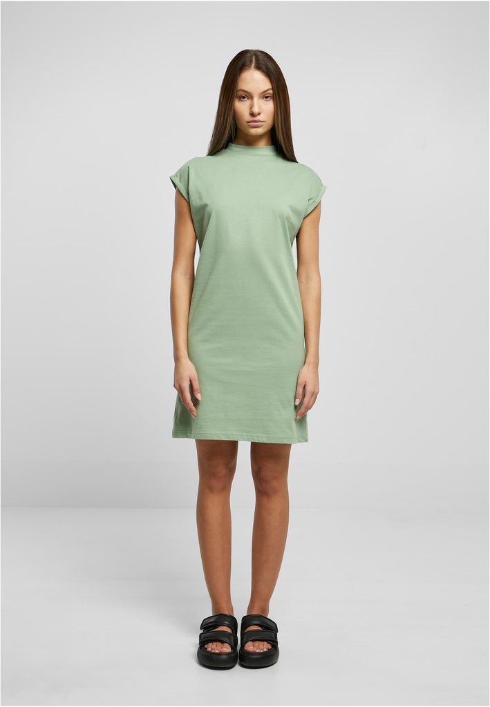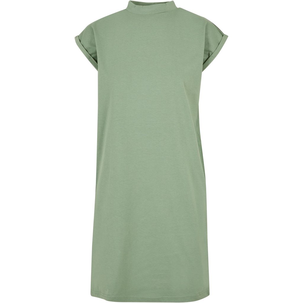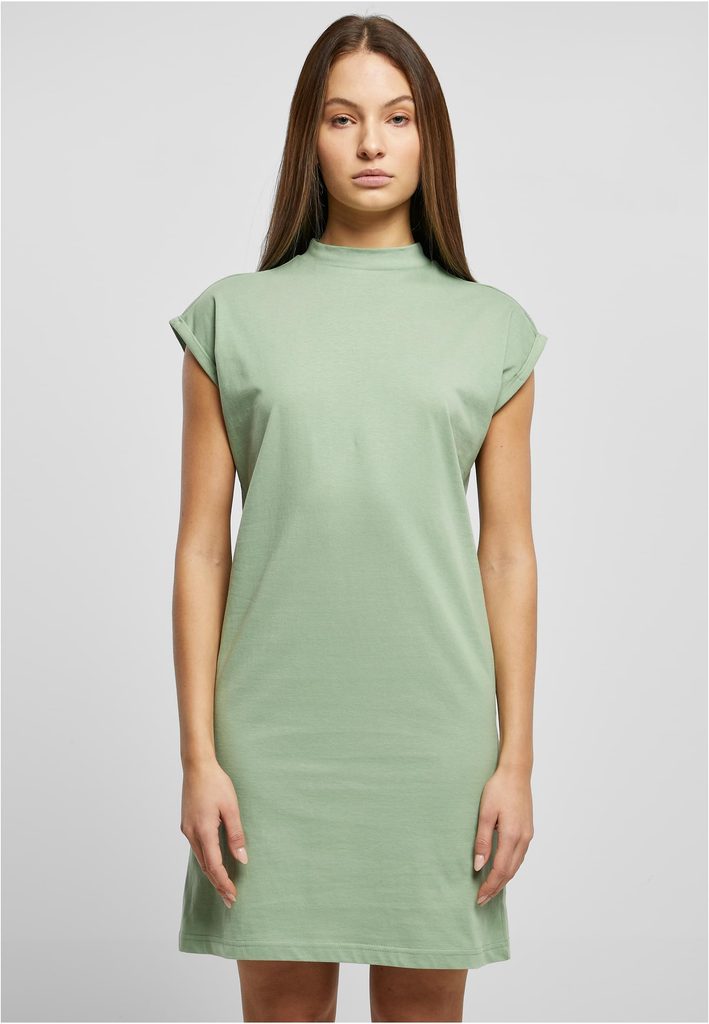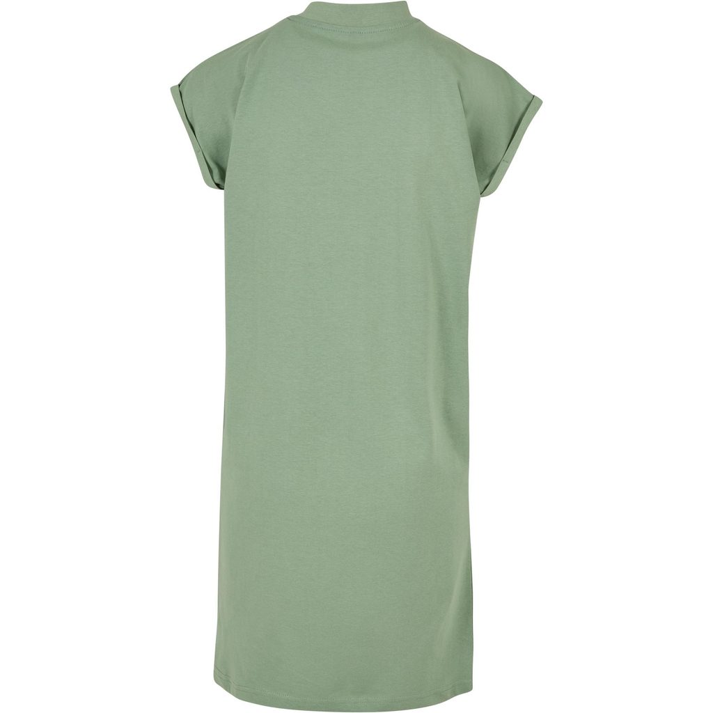 Das bequeme T-Shirt-Kleid für Damen mit kurzen Ärmeln, leicht überschnittenen Schultern und Stehkragen ist aus einem angenehmen Baumwollmaterial gefertigt. Es hat einen bequemen Schnitt mit einer Knielänge, die es einfach zu tragen macht. Es kombiniert perfekt den Komfort eines T-Shirts und den modischen Stil eines Kleides. Der Gesamtlook wird durch einen Mini-Stehkragen und lässig umgeschlagene Ärmel abgerundet.