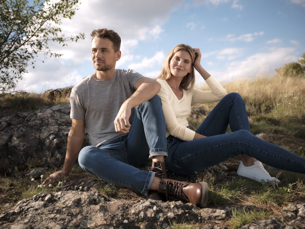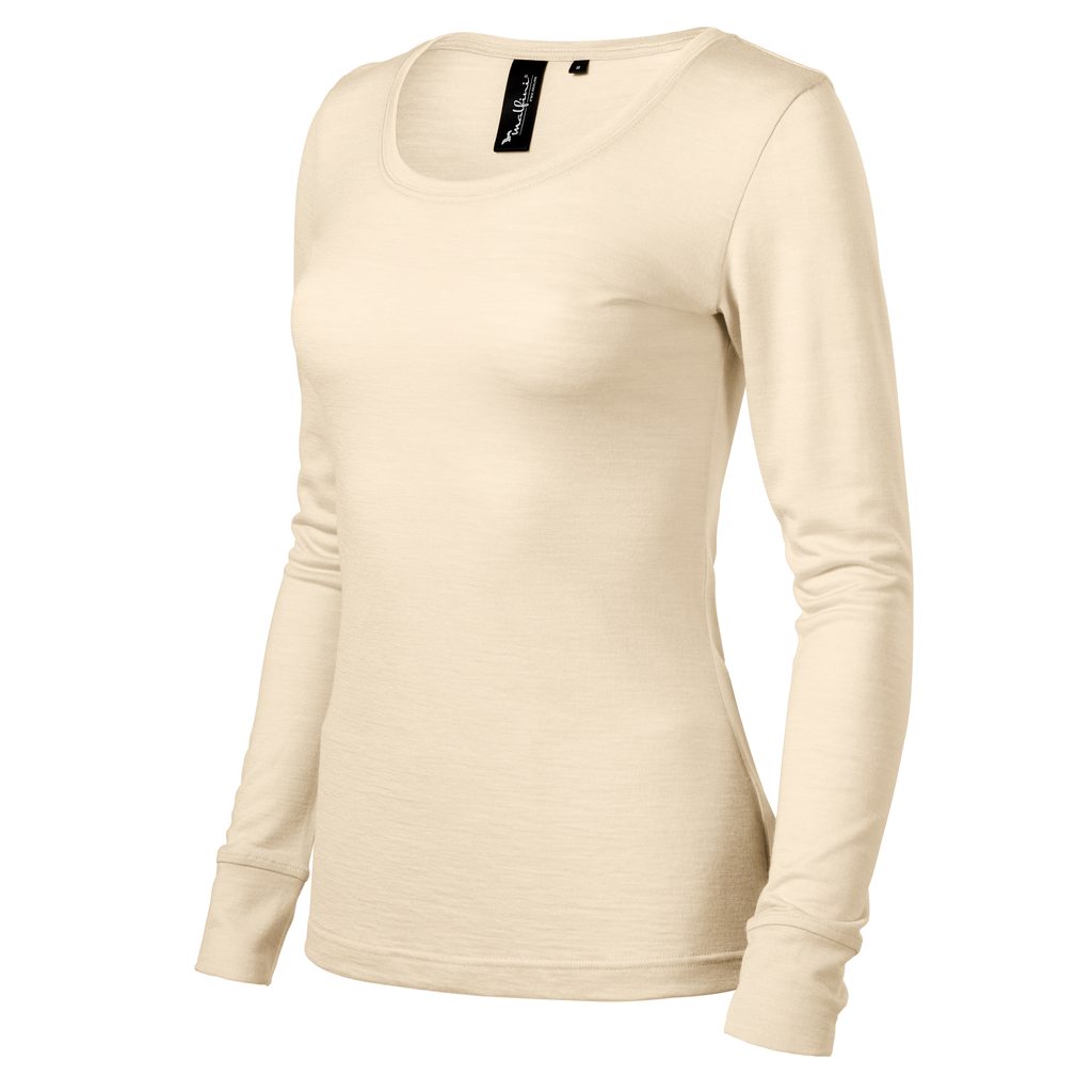 Langärmeliges Damen-T-Shirt aus extrafeiner Merinowolle. Das T-Shirt hat eine körpernahe Passform mit einem tieferen Rundhalsausschnitt, der die weibliche Silhouette akzentuiert. Der Halsausschnitt hat einen schmalen Saum aus Obermaterial, die Innenseite des Shirts ist mit einem Band aus demselben…
