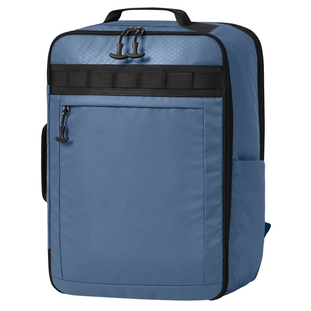 An der Außenseite befindet sich eine große Fronttasche mit Reißverschluss, eine Seitentasche, ideal zum Beispiel für eine Flasche, sowie zwei stabile Tragegriffe für bequemes Tragen in der Hand. Ebenfalls vorhanden ist ein Gurt auf der Rückseite zur einfachen Befestigung des Rucksacks am Trolleygriff.