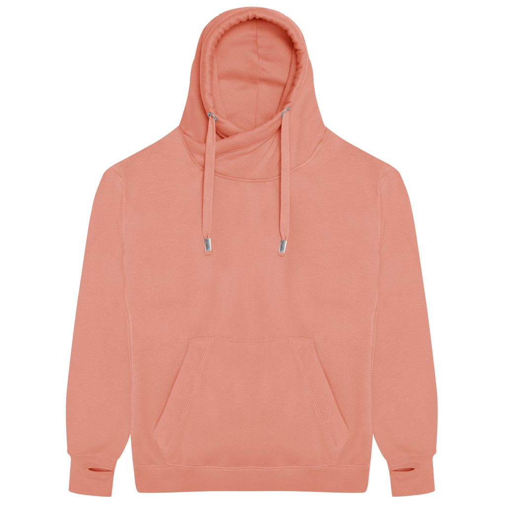 Der moderne Unisex-Kapuzenpullover hat einen ungewöhnlich gestalteten Kragen mit einer modischen Kreuzung. Die Kapuze ist dank flacher Kordelzüge verstellbar. Die Tasche ist im beliebten "Känguru"-Stil gestaltet. Der untere Saum und die Ärmelsäume sind gerippt und an den Ärmelsäumen befinden sich Daumenlöcher, damit auch die Hände warm bleiben. Im Inneren des Sweatshirts befindet sich ein warmes, gebürstetes Fleece, das angenehm warm ist. Die Etiketten sind abreißbar und die weiche Baumwolle macht das Sweatshirt nicht nur bequem, sondern auch geeignet zum Bedrucken.